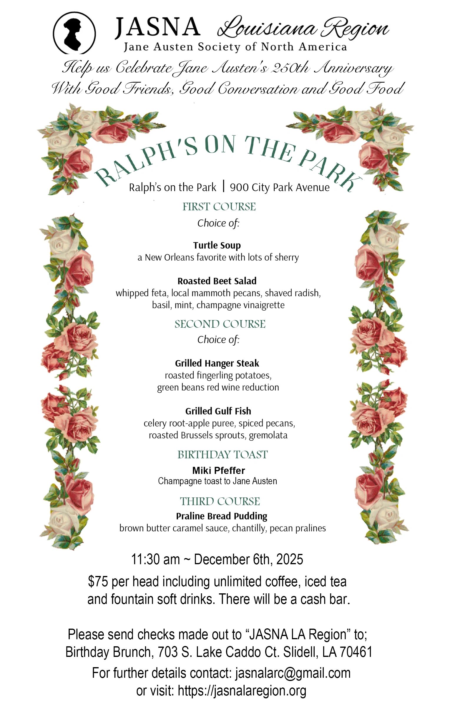This 250th anniversary of Jane Austen's birth is a special year for JASNA and we are moving our annual birthday brunch to a new location. Please join us at Ralph's on the Park on Saturday December 6th at 11:30 am.